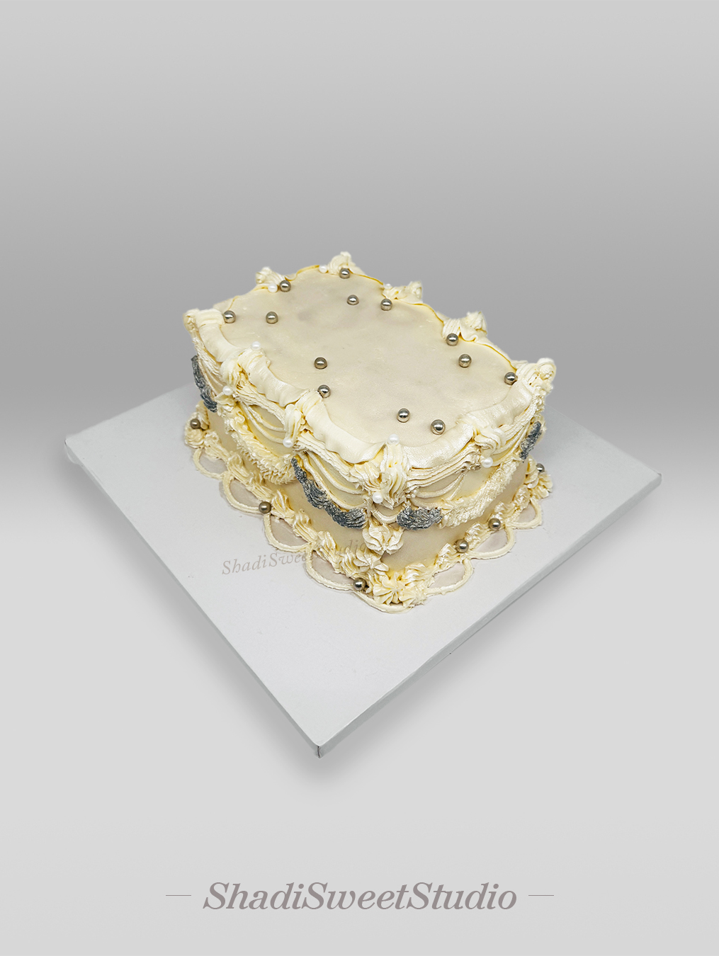 - Fully hand-piped ivory buttercream with silver accent detailing